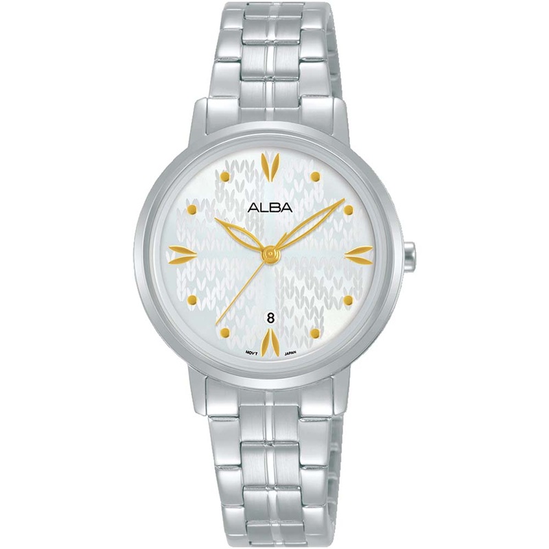 Introducing the Alba Fashion AH7Z05X1, an elegant timepiece featuring a silver dial complemented by gold time markers and hands. With a refined 30mm stainless steel case size and matching bracelet, this watch blends sophistication with versatility.Powered by the precise Caliber VJ22 quartz movement, the AH7Z05X1 ensures accurate timekeeping powered by a battery, providing reliability for daily wear. A pull-out crown facilitates easy adjustments, enhancing user convenience.Protected by a durable mineral crystal, the dial maintains clarity and resists scratches, preserving its pristine appearance over time. While specific water resistance details are not provided, the watch is designed to withstand everyday exposure to water, such as rain or hand washing.The Alba Fashion AH7Z05X1 combines timeless design with practical features, making it a suitable accessory for various occasions. Its silver dial with gold accents adds a touch of elegance, appealing to individuals who appreciate both style and functionality in their watch.- Caliber VJ22- 30mm Case Size – Stainless Steel Case and Bracelet – Mineral Crystal – Date Display – Pull Out Crown – Water Resistant