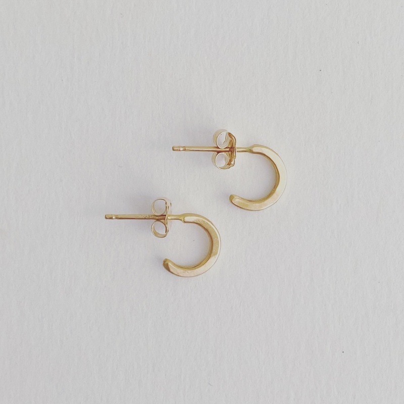 The perfect huggie hoop. Made from solid 14k yellow gold. With 14k yellow gold posts and ear nuts. Hand forged, hammered and finished in Aspen CO