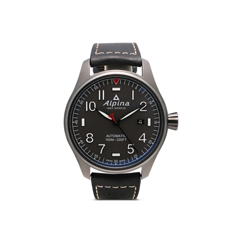Preowned Alpina Startimer Pilot Watch. Synthetic sapphire crystal. Automatic winding. Caliber AL-525. Gunmetal-tone stainless steel case. Dark grey dial. Screw-in crown. Black genuine leather strap. Tang Buckle. Date. 44mm case diameter.