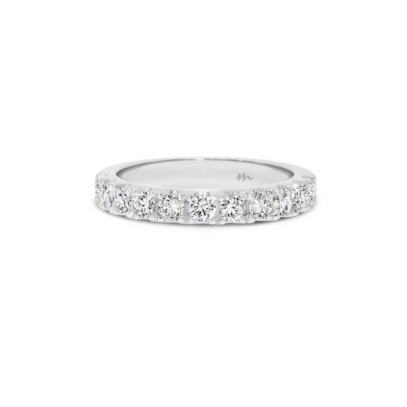 The 'Angela' Moissanite wedding ring showcases a prong set row of 2.5mm Round Moissanite. This glistening design is big and bold and is a truly show stopping piece that makes a statement.