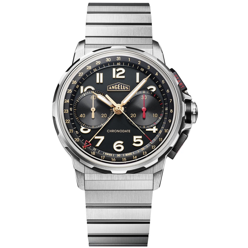 Angelus Watch Chronodate Titanium Black Titanium 0CDYF.B02A.M009T. Around this container, Angelus has designed an attachment system consisting of an openworked cradle that brings the case middle and lugs into a single line, made from 5N red gold or titanium. It also houses the bezel marked with 12 notches, which is also cut from these same metals.