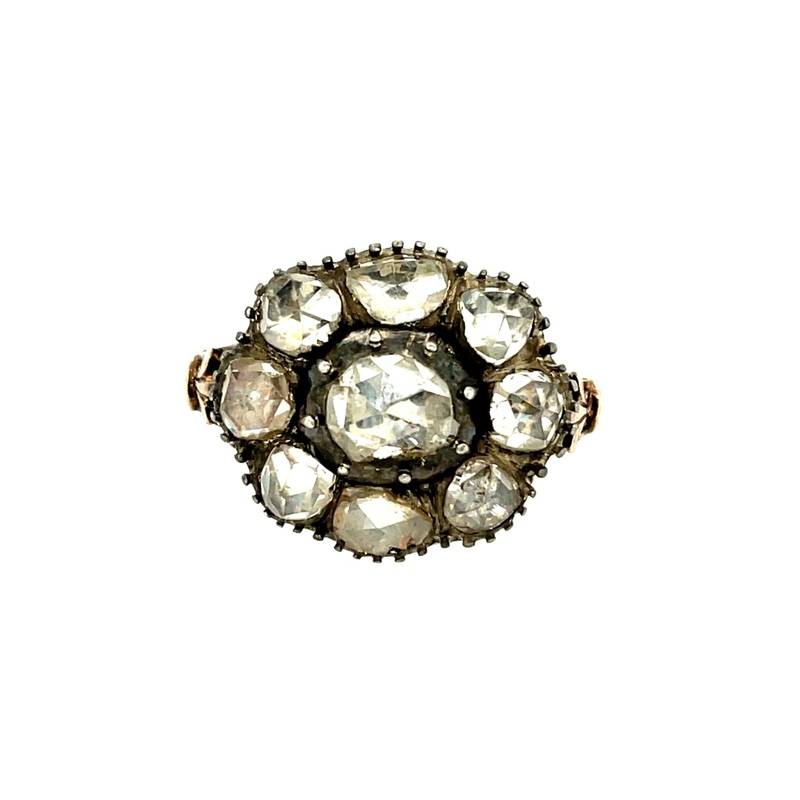 This vintage ring, dating back to circa 1780, features an antique design with a cluster of rose-cut diamonds set in 18kt blackened gold. The total estimated diamond weight is approximately 2.00 carats, showcasing excellent craftsmanship and a beautiful mounting. Please note that this ring is not resizable.