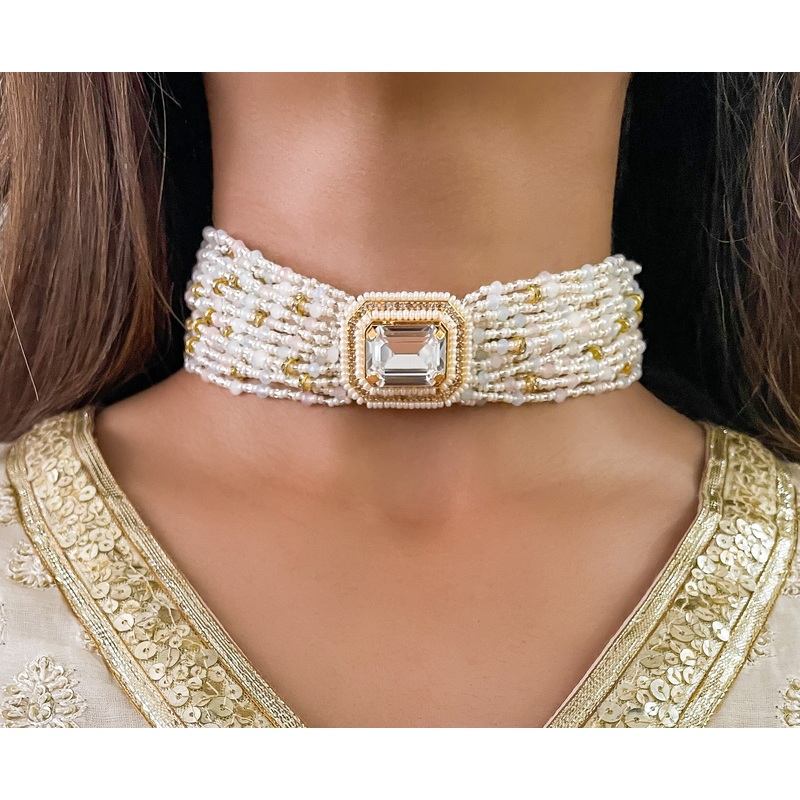The Aqsa Choker Set and our Noor Crystal Earring Studs are from our Jannah Collection.Classic yet traditional this choker set has everything you need to complete your festive look. Strung with a line of beads and semi-precious stones, this is a piece every