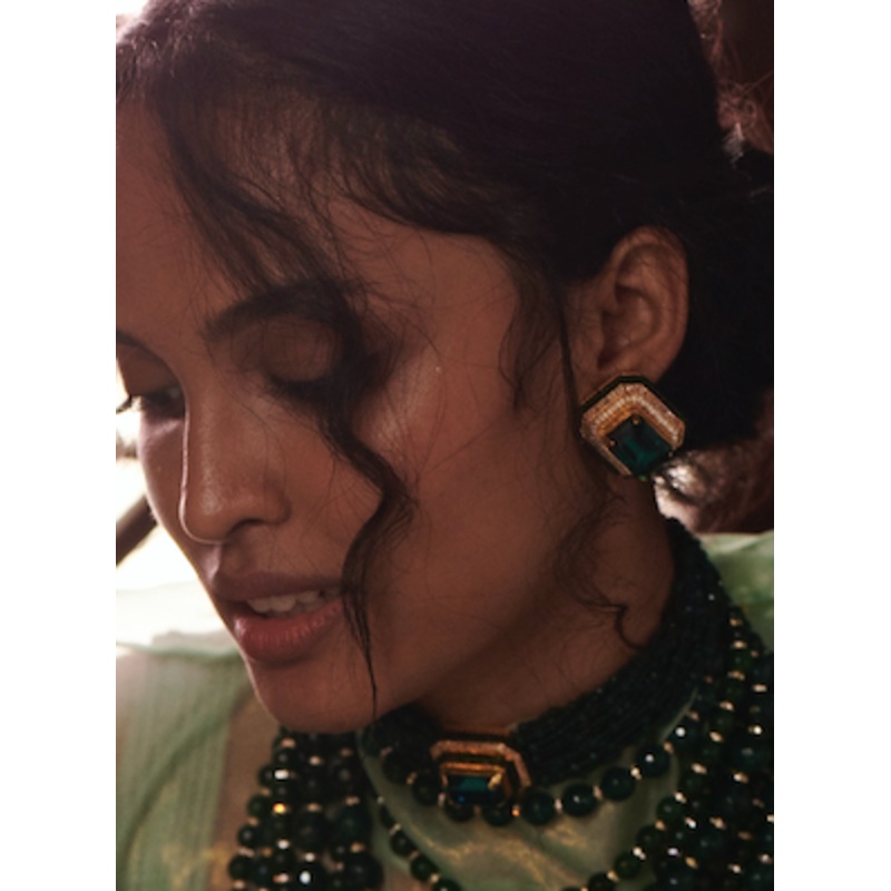 Adorned with pearls, diamonds and beads, this 24k gold plated emerald stud is sure to make a statement in any outfit you adorn.Simple yet so Elegant & Versatile.