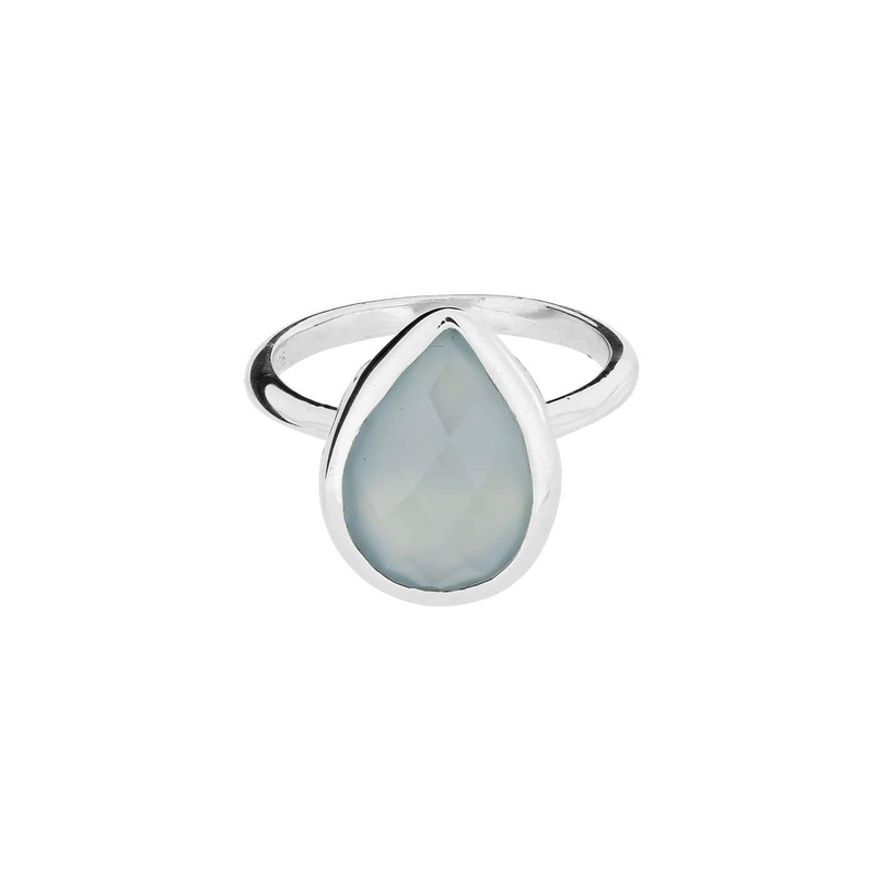 A stunning teardrop shaped, multi-facetedaqua chalcedonystone sits encircled in a simple polished setting on a slim silver band. The open setting allows as much light as possible to enter the gem and show off its depth of colour.