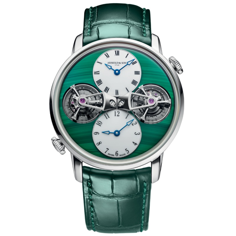 Arnold & Sons Watch Double Tourbillon White Gold Malachite Limited Edition 1DTAW.Z03A.C188W. Stone of the sky, stone of the Earth. As green as a virgin forest, malachite places Double Tourbillon White Gold firmly on the earth. As sparkling as a starry sky, aventurine raises it to the heavens. Harnessing the beauty of stone and glass, these two Arnold & Son pieces, each a one off, reveal the duality of its double tourbillon. Their spirit is entirely in keeping with the brands historic heritage. John Arnolds marine chronometers sought to tell the local time by observing the stars and the time in a distant location as a universal reference point. Thus, Double Tourbillon White Golds sophisticated calibre can follow two distinct time zones to the minute.