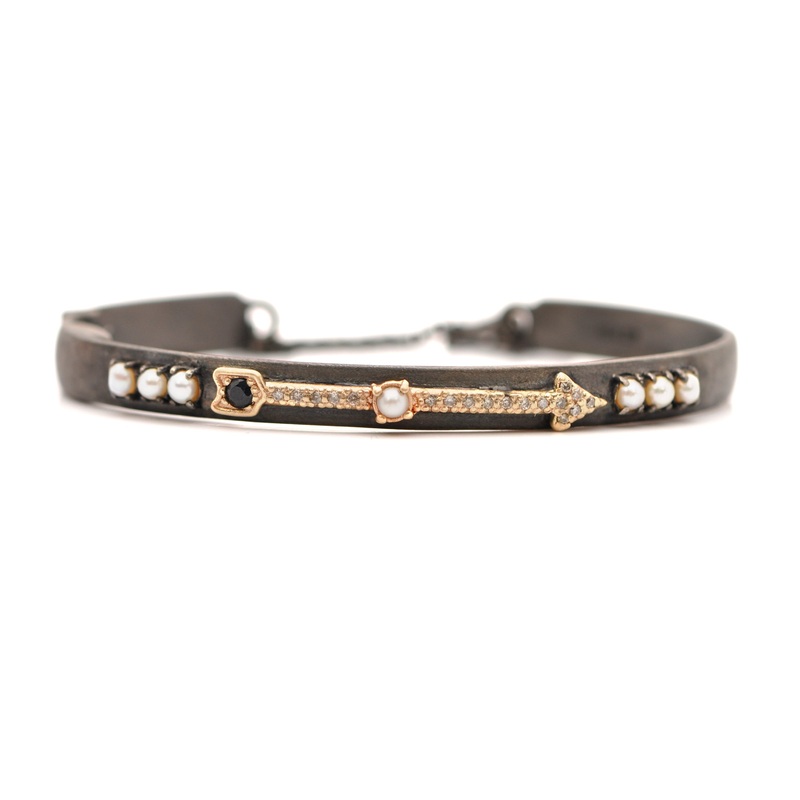 14k Rose Gold and Blackened rhodium finish Sterling Silver kick cuff featuring an arrow with black sapphires, white pearls and champagne diamonds. Safety chain with toggle closure.