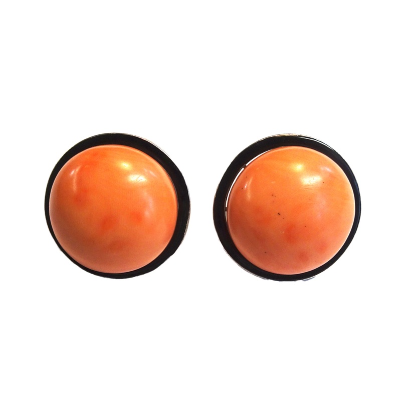 These vintage coral enamel earrings are from the Art Deco design period. The earrings feature large salmon-colored coral buttons encased in a black enamel rim, set in 18KT yellow gold. They weigh a total of 35g and measure 3 cm each.