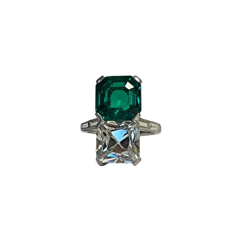 This emerald and diamond twin ring is a rare, early Art Deco piece featuring an exotic 4.28-carat Mazarin-cut diamond and a 4.18-carat old Colombian minor oil emerald. Crafted in platinum with a ring size of 4.75 (US), this vintage item showcases the influence of Italian Cardinal Jules Mazarini on diamond cutting during his service as Minister of Industry to French Kings XIII & XIV. It is accompanied by an AGL report confirming the quality of the emerald.