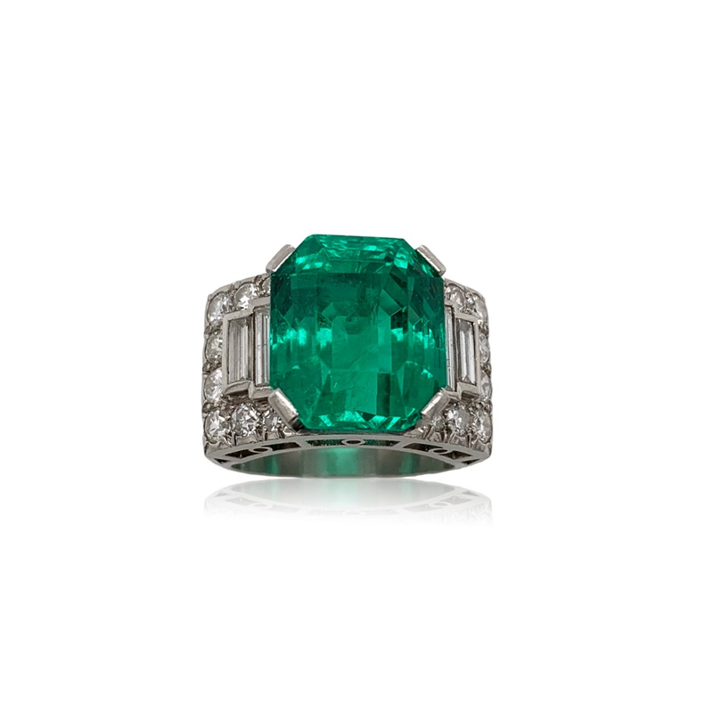 This ring is a strong example of Art Deco style featuring a stunning emerald-cut Colombian emerald with minor oil treatment weighing about 10.87 carats. The ring is set in platinum and is complemented by diamonds for added sparkle. It’s available in a US size 5 and accompanied by a SSEF report. It can be resized (slightly).