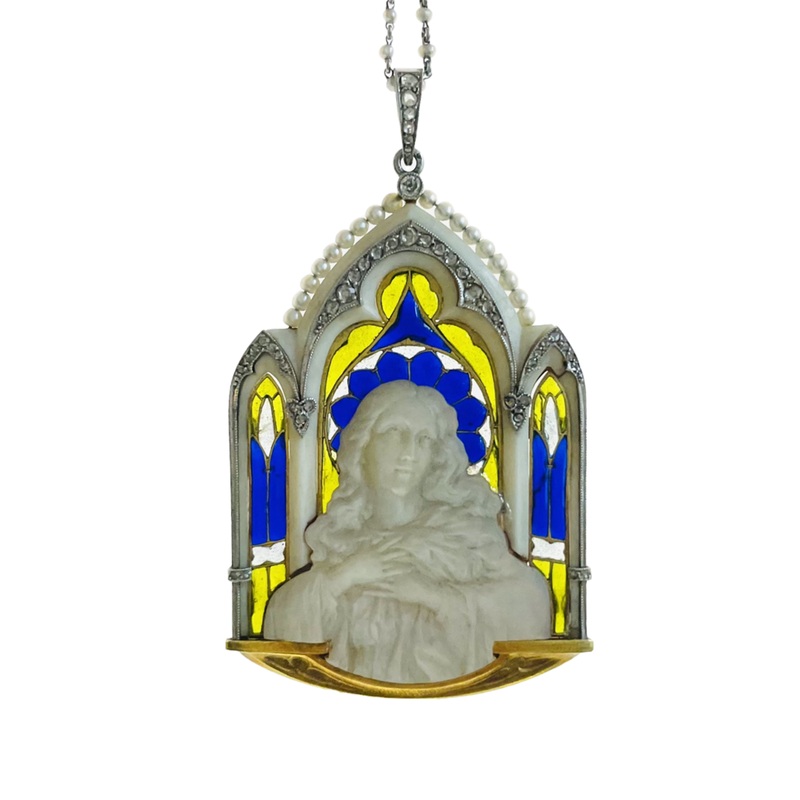 This Plique–Jour pendant features a Mother of Pearl Madonna set within an Art Nouveau style cathedral, crafted from 18KT yellow gold. The pendant is adorned with enamel, diamond and natural pearl, adding to its vintage charm. It has a total weight of 17 grams, measures 3.4 x 5 cm and comes attached to a platinum and seed pearl chain for easy wearability.