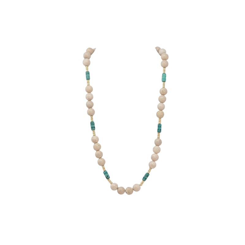 18k Yellow Gold 20″ artifact beaded necklace with 10mm fossilized jasper, organic pebble beads and artifact carved stations in Teal patina. Adjustable at 16″, 17″ and 18″ with toggle closure.