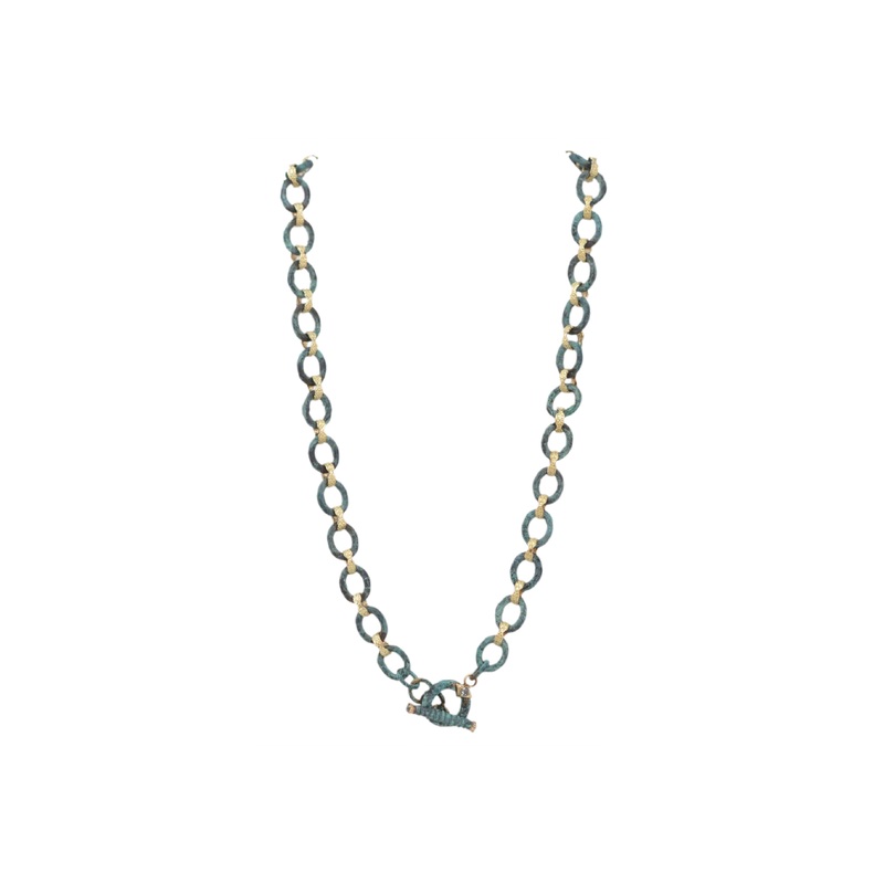 18k Yellow Gold 20″ Artifact link necklace in Teal Patina with toggle closure and Blue Grey Sapphire detail.