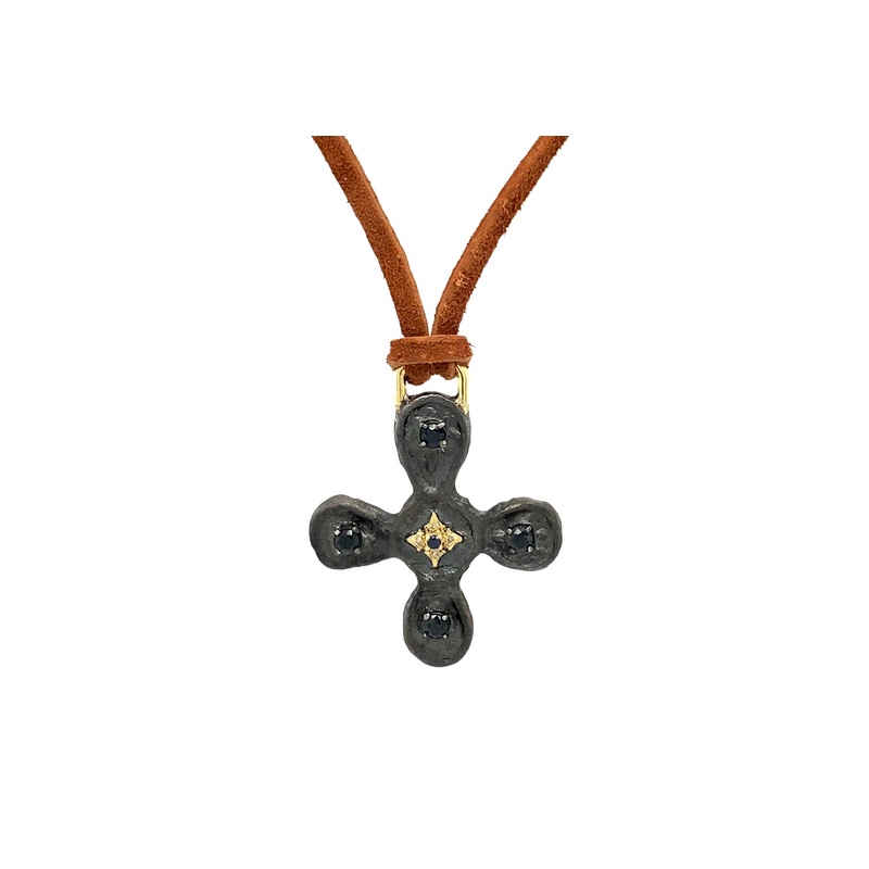 18k Yellow Gold and Blackened Sterling Silver Artifact 45mm Artifact Cross Necklace With Champagne Diamonds and Black Sapphires on Suede Cord. (.03 TCW)