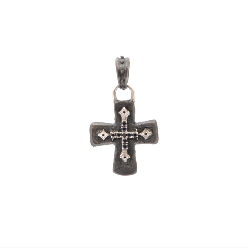 Grey and Blackened Sterling Silver 33mm artifact cross enhancer with black sapphires.