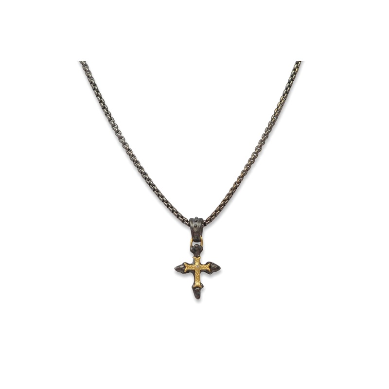 18k Yellow Gold and Blackened Sterling Silver 22" necklace with 25mm artifact cross enhancer and a white diamond crivelli .