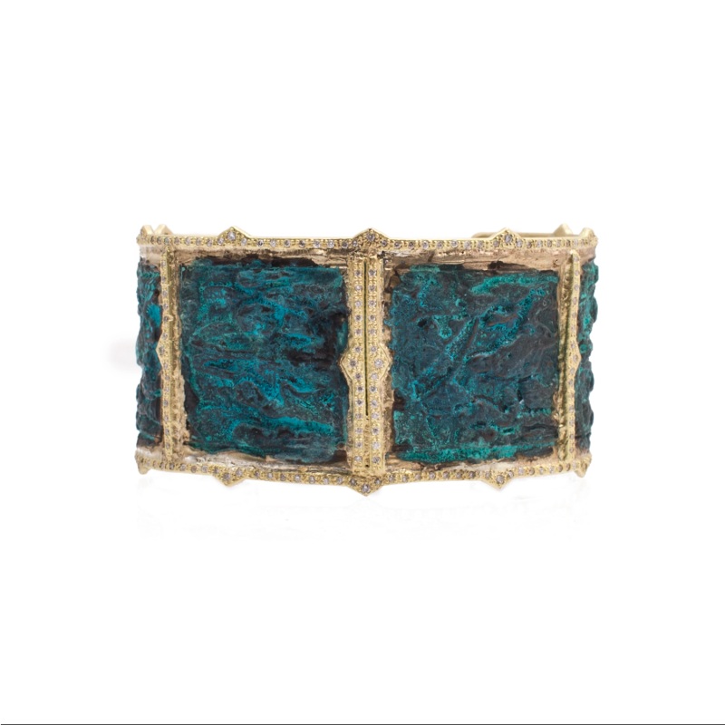 18K Yellow Gold Hieroglyphic Artifact Wide Cuff with White Diamonds in Teal Patina. (0.87 TCW)