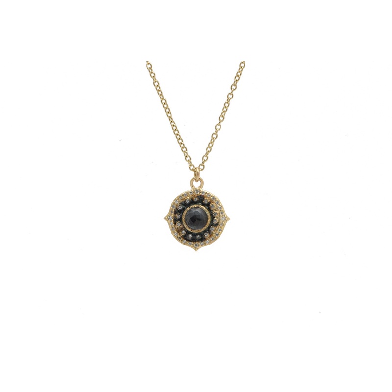 18K Yellow Gold 12MM Pointed Round Artifact Drop Necklace with Hematite/White Quartz Cabochon and White Diamonds. Adjustable at 16″-18″ (0.19 TCW)