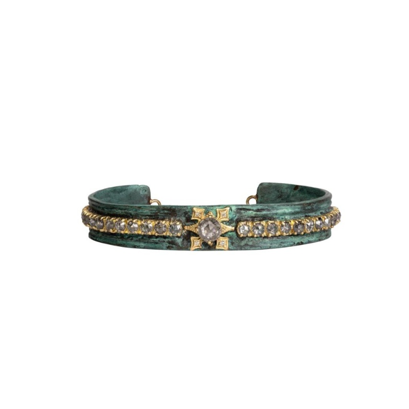 Bracelet 18k Yellow Gold Artifact teal patina crivelli with 3.103CT Grey Diamonds.