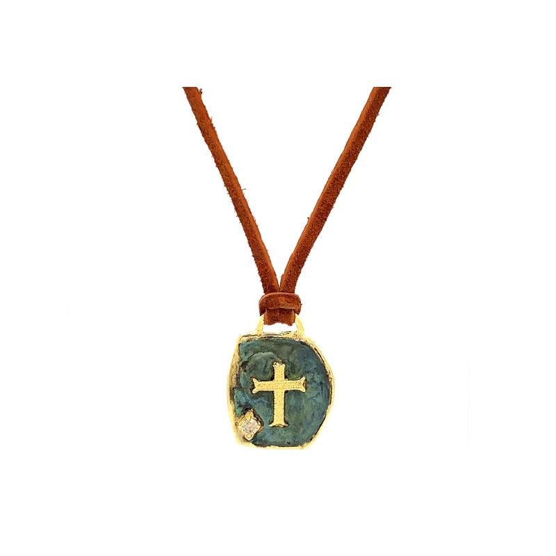 18k Yellow Gold and Grey Sterling Silver 25mm Square Ancient Artifact Medallion With Green Patina, Carved Texture and a Champagne Diamond Crivelli on a Brown Leather Cord. (.01 TCW)