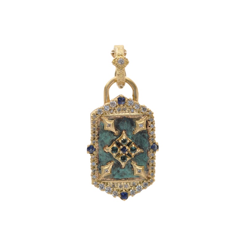 18k yellow gold artifact enhancer in teal patina with crivellis, rubies and white diamonds.