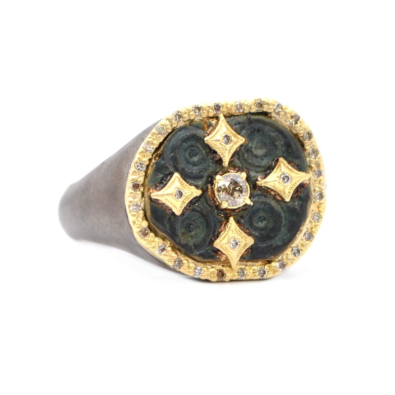 18k Yellow Gold, grey and Blackened Sterling Silver artifact tapered ring with green patina, crivelli and champagne diamonds.