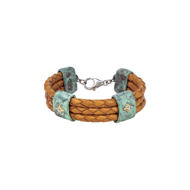 Romero Bracelet 18k Yellow Gold and Grey Sterling Silver Artifact teal patina with 0.217 CT Grey Diamonds and Brown Leather.
