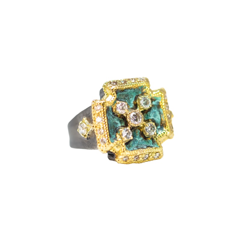 ARTIFACT TEAL PATINA GOLD AND DIAMONDS CROSS SIGNET RING