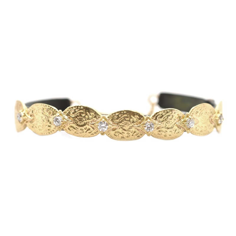 18k Yellow Gold artifact kick cuff with patina and 0.55TCW white diamonds. Safety chain and toggle closure. Measures 9.7 wide.