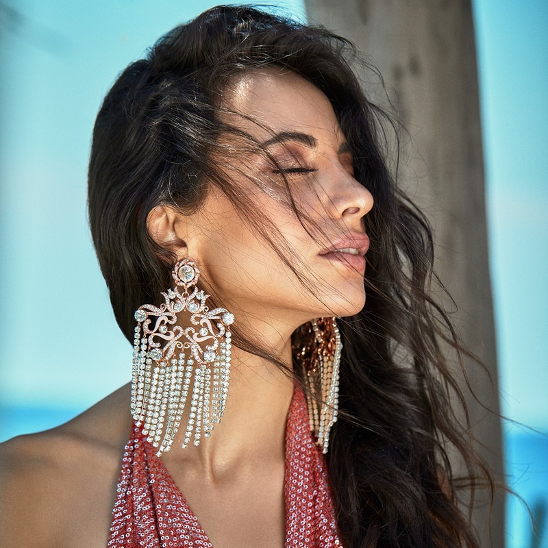 This whimsical designs features sculptural crystals with gracefully dropping sworovski goodness.Its ALL Glitz ALL Glam with this absolutely stunning statement earring !