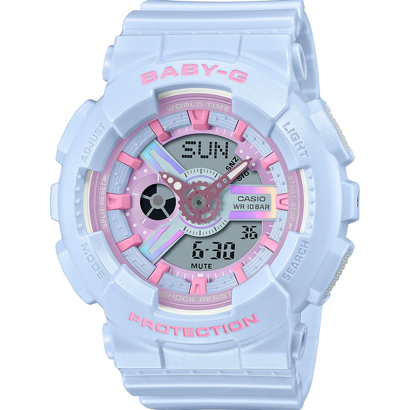 This new BABY-G model BA110FH-2A design theme is based around the virtual world, and the futuristic designs are constructed with polarized colours that change vary in different lighting and angles. This model is beautifully designed with a glossy polarized finish on the bezel and hands. The resin parts featured on the dial is made with a pearl paint finish. When the timepiece is viewed from different angles and direction of light it accentuates the coloured beauty. The model comes constructed with shock-resistant structures and 100 meters water resistance, which means its the perfect watch for everyday wear without hassle or worry. – Module No. 5338- 46.3 x 43.4 x 15.8mm Case Size – 45g Weight – Shock resistant- LED light: Afterglow- World time: 29 time zones (48 cities + coordinated universal time), daylight saving on/off- Stopwatch – Countdown timer- Alarm: 5 daily alarms (with 1 snooze alarm)- Calendar: Full auto-calendar (to year 2099)- 12/24-hour format- Button operation tone on/off- Regular timekeeping*Analog: 2 hands (hour, minute (hand moves every 20 seconds))*Digital: Hour, minute, second, pm, month, date, day- Accuracy: 30 seconds per month- Approx. battery life: 2 years on SR726W2
