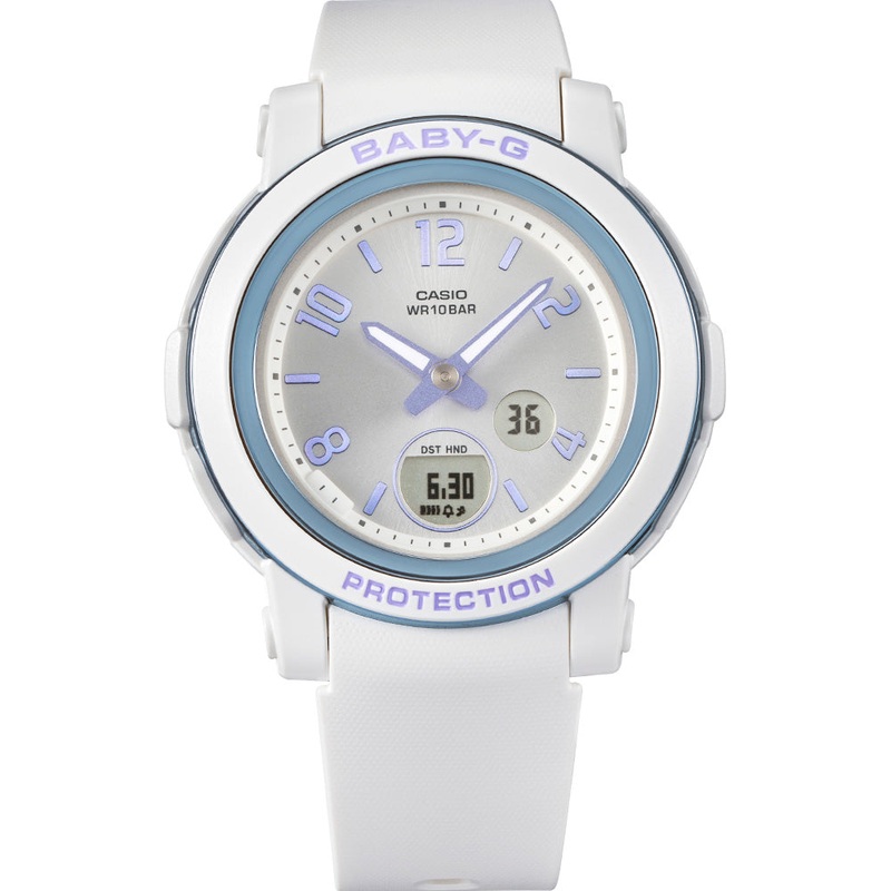 A sweet piece, this Baby-G BGA290DR-7A Dreamy Accent Womens Watch is great for daily wear. Baby-G offers amazing features in shock resistance and water resistance, in a more compact and streamline design. The round dial is white with purple metal indices as well as a digital display. The band is crafted in white resin, which is both durable and comfortable. Due to the simple design, this watch will go with many outfits and can be dressed up or down.