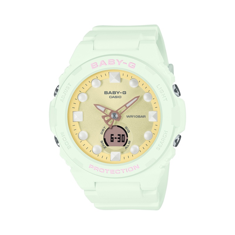 The BABY-G DUO Holographic Green Resin Band Watch BGA320FH-3A captures playful elegance with a futuristic twist, blending a pastel green resin band and bezel with a shimmering yellow dial that shifts color with movement. Designed for women who appreciate both fashion and function, this quartz movement timepiece features shock resistance, 100-meter water resistance, a mineral crystal face, and a full auto-calendar through 2099. The holographic aesthetic, combined with raised index markers and Super Illuminator LED lighting, delivers standout style in any setting. Perfect for everyday wear or vibrant adventures, this women’s watch offers world time, alarms, stopwatch, timer, and dual time functions with enduring precision.