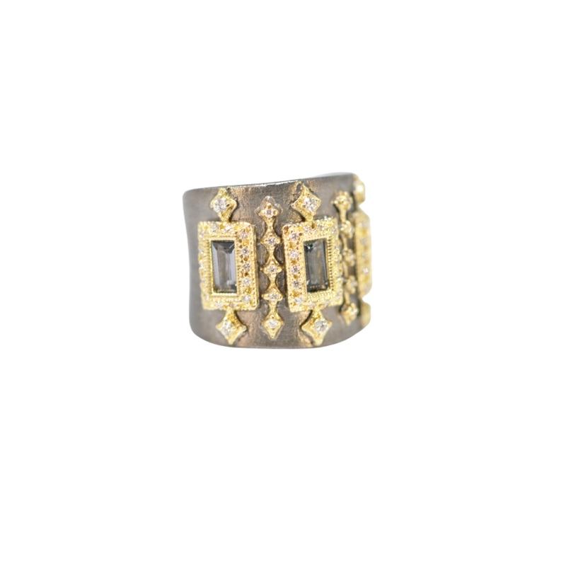 Ring 18k Yellow Gold and Grey Sterling Silver with 0.222 CT White Diamonds and Blue Baguette Sipnel.