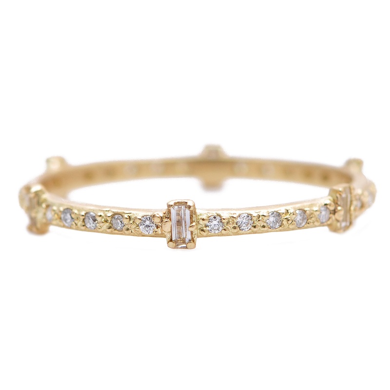 Exquisitely crafted from 18k yellow gold, this rings geometric contemporary design is illuminated by diamonds and luxurious white sapphire baguettes. Elegant stack band from the Sueno Collection sits beautifully next to a Rustic or Black diamond wedding engagement ring, or pair it with your favorite stack bands to create the perfect ring sculpture.