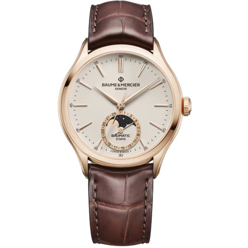 Baume et Mercier Watch Clifton Mens 10736. As a moon-phase and date timepiece, the Clifton Baumatic 10736 embodies the quintessence of refinement with its 18K pink gold case, grained off-white dial and gilded attributes. It comes with an interchangeable brown alligator strap adorned with tone-on-tone stitching.
