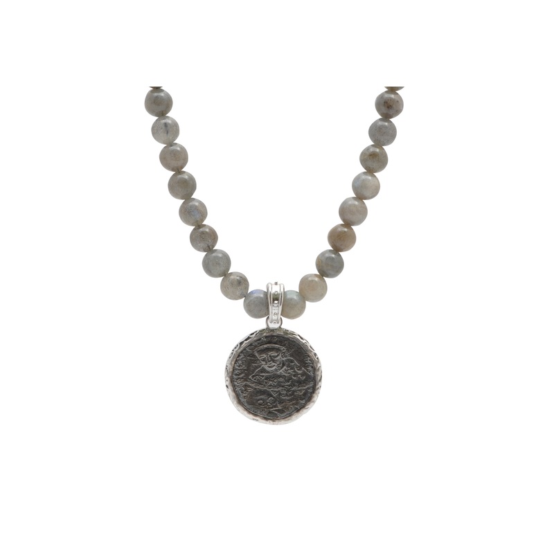 Sterling Silver and Blackened Sterling Silver 30″ Labradorite Beaded Necklace with Monk Medallion Pendant.