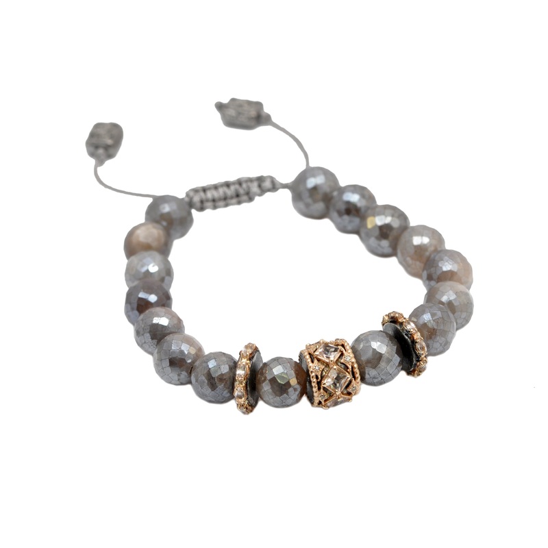 14K Gold and Grey Sterling Silver Moonstone Beaded Pull Bracelet with Morganite on Grey Knotted Cord (0.07 TCW)