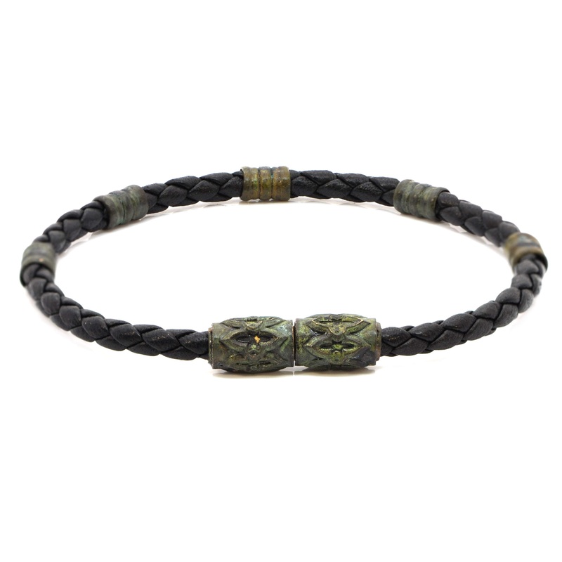 Green patina brass single wrap woven 8.25″ black braided leather bracelet with 5 organic pebble bead stations and scroll magnetic closure.