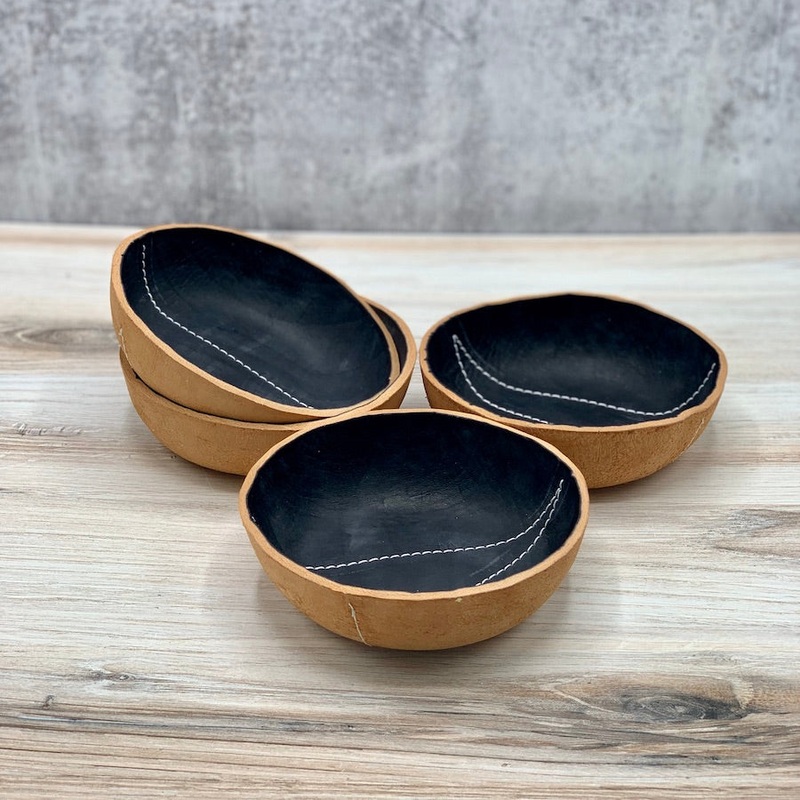 Hand-formed leather bowls. These are perfect for holding little treasures, or just displayed on their own. medium: 5" diameterLeather/ink/stitching. All bowls are one-of-a-kind, please allow for slight variation from photo.
