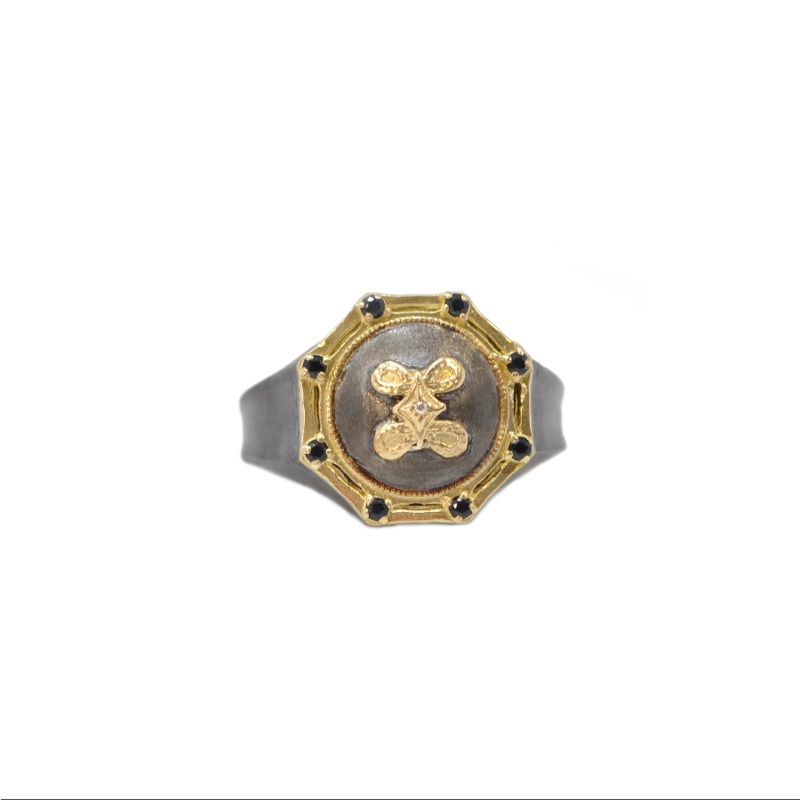 18k Yellow Gold and Blackened Crivelli MensSignetRingwith 0.005 CT and Black Sapphires.