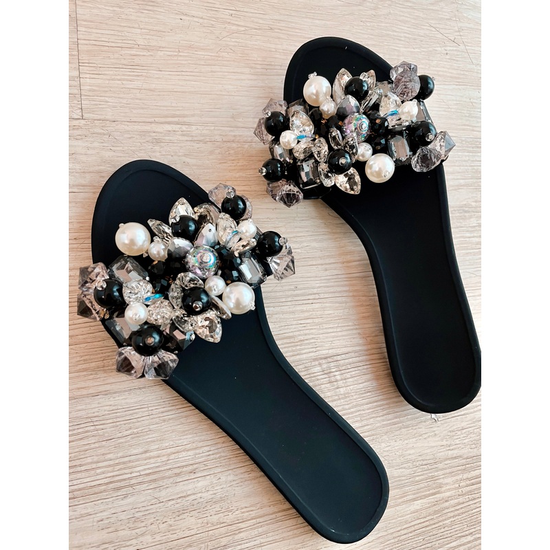 The Waterproof Crystal Embellished Sliders made from waterproof material embellished with Swarovski Crystals & Semi Precious Pearls. It is the perfect Slider to step out in these rainy days.
