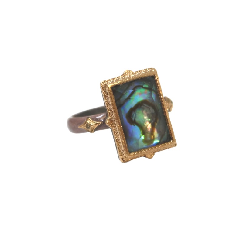 14k Rose Gold and Silver Ring with Dusty Rose Enamel Crivelli with 0.01 CT Champagne Diamonds and 13×9 Blue Mother of Pearl.