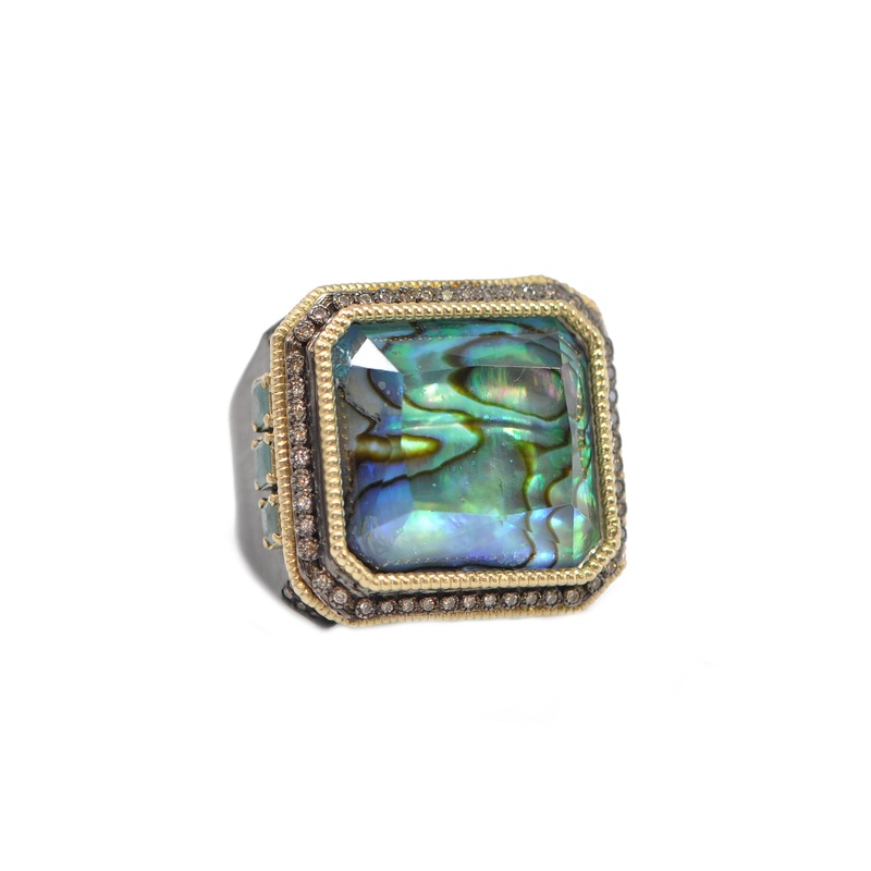 18k Yellow Gold and Grey Sterling SilverRing with20X18 Blue Mother of Pearl and0.49 CT White and Champagne Diamonds.