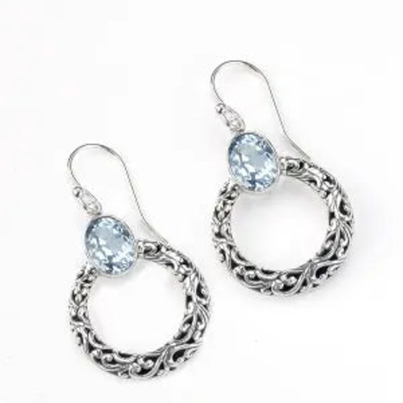 Circle dangling earring with blue topaz set in sterling silver with a french wire closure.