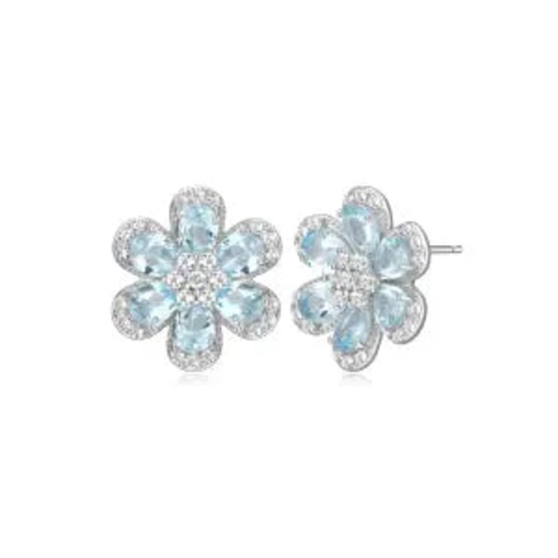 Blue topaz and white topaz flower stud earrings set in sterling silver with a post and friction back closure.