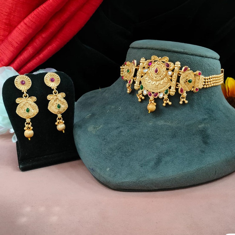 This Blythediva gold plated choker necklace set features intricate pota stones and delicate beads, creating a stunning and luxurious look. Handcrafted with expert precision, this necklace set adds a touch of elegance to any outfit. Elevate your style with this glamorous and unique piece. Note: Image may be vary slightly from the actual product.