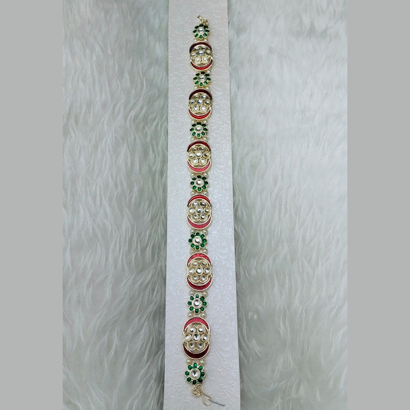 This Bodhi Creation Gold Plated Kundan Stone And Meenakari Sheeshphool is a stunning piece of jewelry that combines traditional Kundan stone and Meenakari techniques. The intricate craftsmanship and gold plating make it a timeless and luxurious accessory. Elevate your look with the elegant and intricate detailing of this sheeshphool.Note: Image may vary slightly from the actual product.
