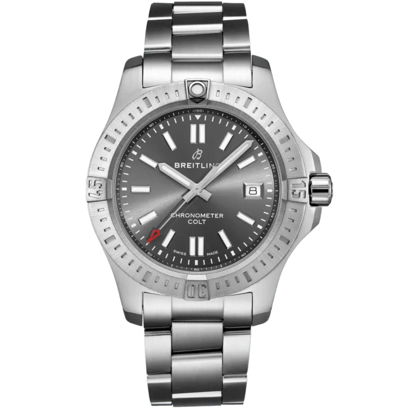 This preowned Breitling Colt watch for men perfectly embodies the youthful and dynamic spirit of one of the Swiss watchmakers most famous designs to date. With a rugged 200 meter water resistant case crafted from stainless steel, this confident 41mm automatic watch is in good condition and comes with full presentation box and paperwork, along with a warranty dated 16/06/20. The Breitling Colt watch is powered by a chronometer certified automatic movement, the Breitling 17 Calibre, which provides a 38 hour power reserve and performs at a rate of 28,800 vibrations per hour. Its sleek and legible anthracite coloured dial is injected with a shot of vibrant red seen in the arrow tipped motif of the central second hand.