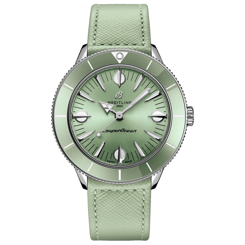Breitling Superocean Heritage '57 Pastel Paradise Mint Green Dial Swiss Automatic Womens Watch Model# A10340361L1X1 reuses several design elements from the original 1957 Superocean such as the concave ceramic bezel, oversized indexes and arrow-shaped hour